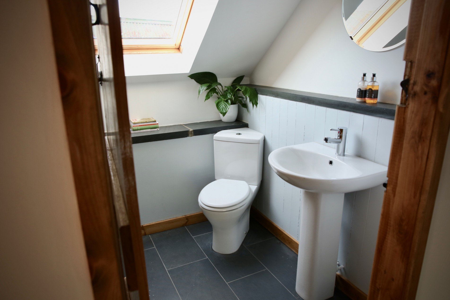 Bathroom 1 has a good sized bath with an over bath shower. A large skylight window allows you to gaze at the stars while having a soak.