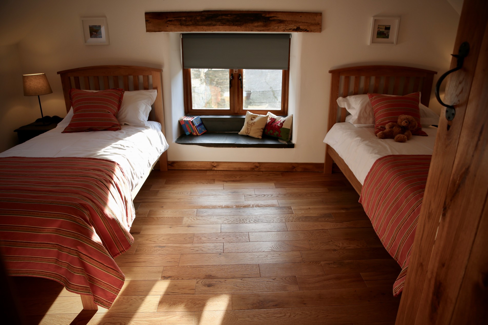 Bedroom 2 has oak twin beds and a folding bed suitable for an additional child or small adult. An oak wardrobe and drawers provides plenty of storage space. There’s a large window with window seat and a skylight window with blackout blinds.